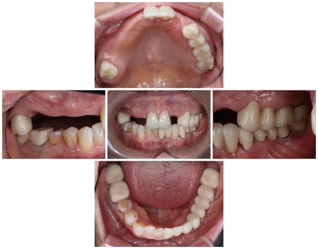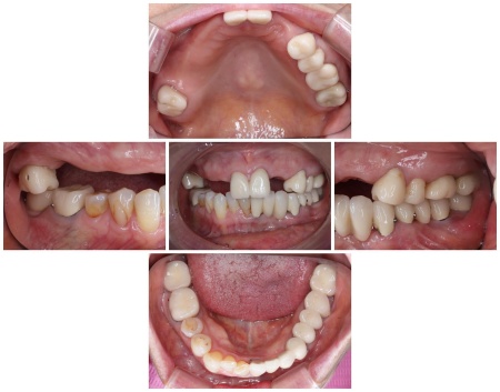 拝見したところ、上顎の歯がない箇所に部分入れ歯が装着されているものの、右上の前歯部分の人工歯が欠けていました。