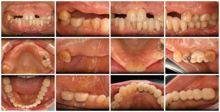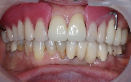まず、残っている上の歯7本を土台の形に削り整えたあと、高さをつけた仮歯を装着しました。